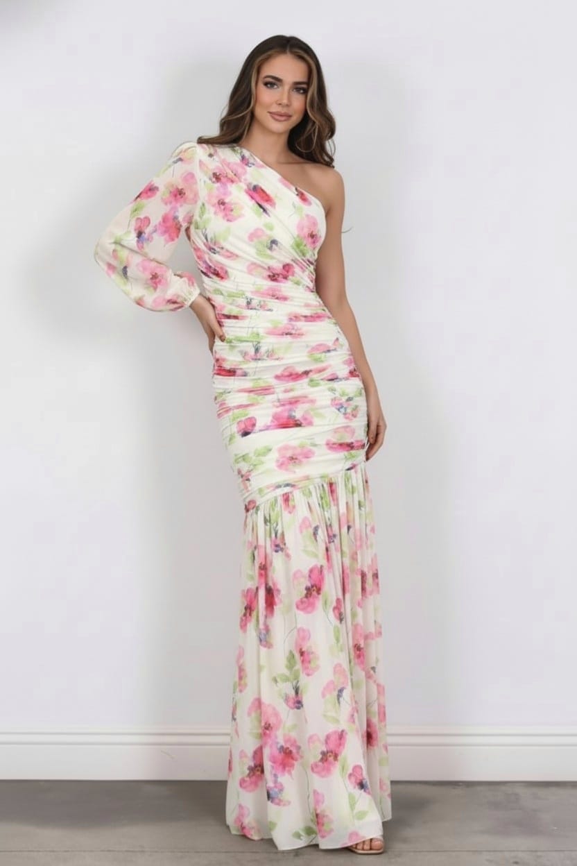 El estampado floral en tonos rosados, verdes y marfil evoca la frescura de un jardín en primavera, mientras que su corte entallado y falda fluida estilizan la silueta con sutileza y movimiento.