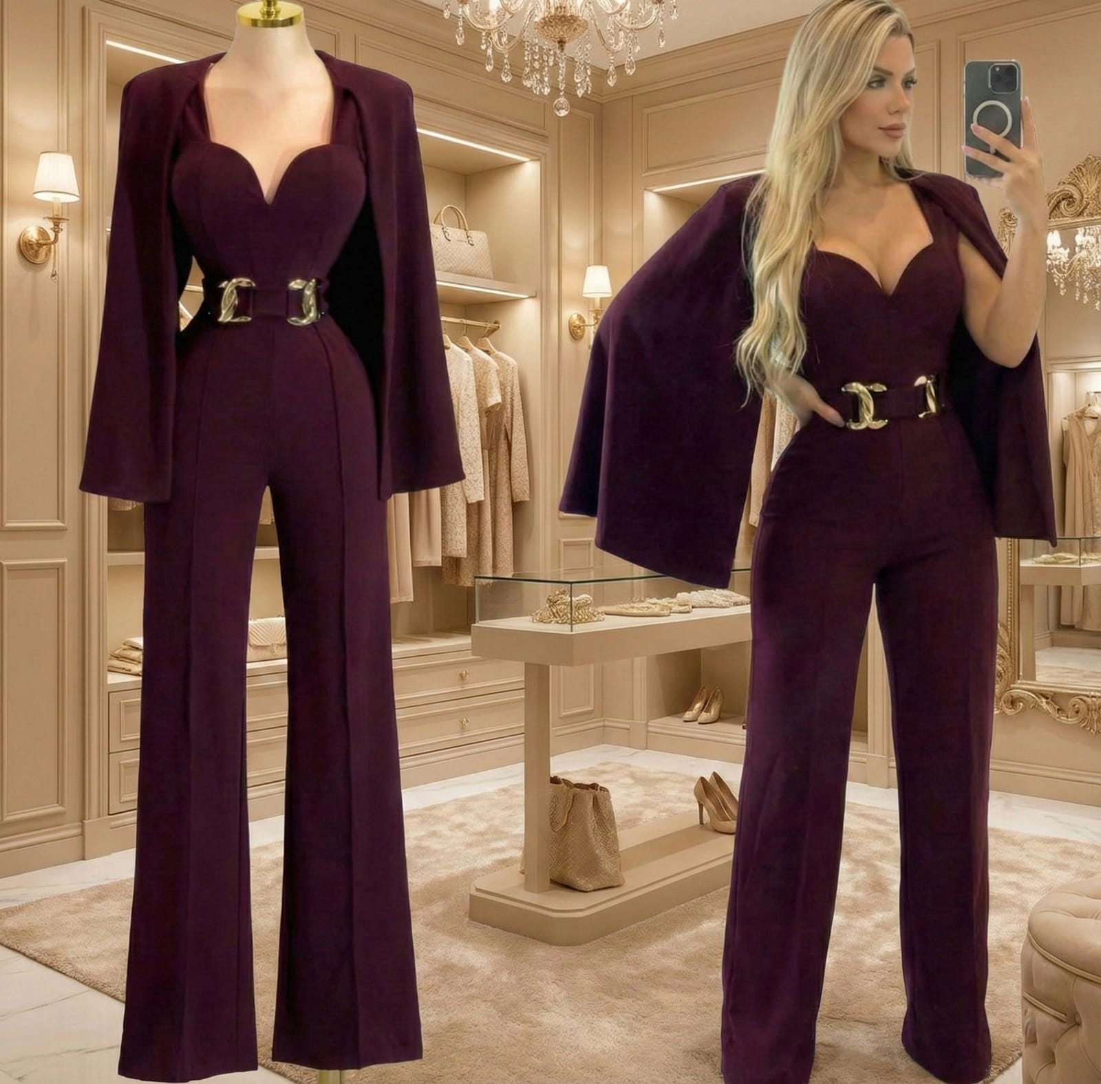 El enterizo presenta un escote corazón estructurado que realza la figura con delicadeza, mientras que el cinturón doble con hebillas metálicas aporta un toque de lujo brillante que acentúa la cintura. El blazer tipo capa añade dramatismo y fluidez al look, creando un movimiento distinguido y una silueta poderosa.