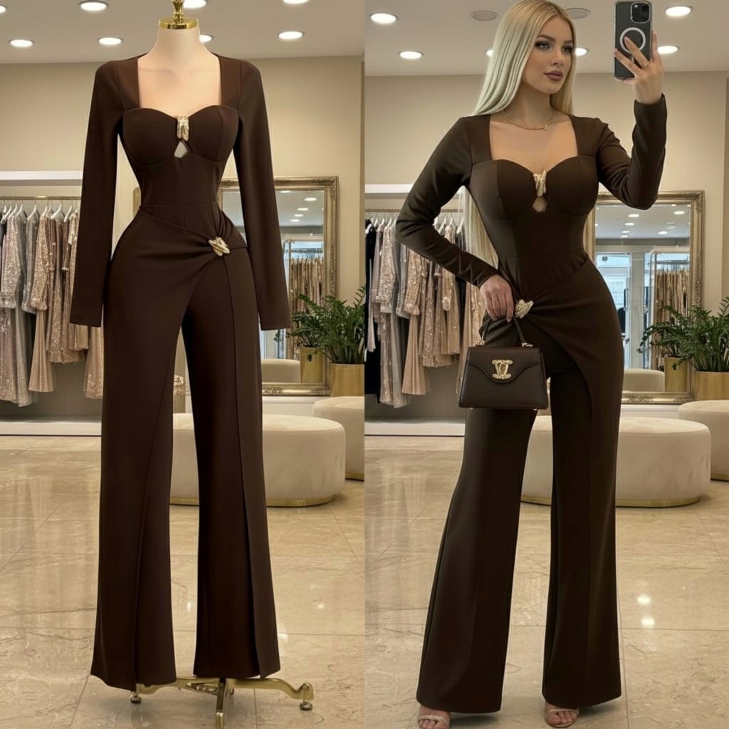 Eleva tu estilo con el Palazzo Espresso Chocolate, una pieza diseñada para realzar la figura con un toque sofisticado y moderno. Su tono café profundo aporta elegancia instantánea, mientras que el cuerpo estructurado con corte corset crea una silueta definida y femenina.