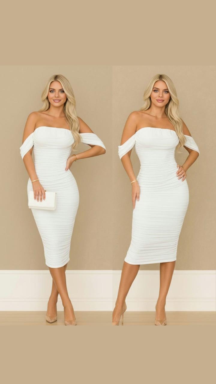 El Vestido Eternelle White es la definición de elegancia atemporal. Su diseño ceñido realza delicadamente la silueta femenina, mientras el tejido drapeado crea una textura sofisticada que equilibra sutileza y glamour. El escote palabra de honor con mangas caídas aporta un toque romántico y moderno, ideal para destacar con clase y confianza.