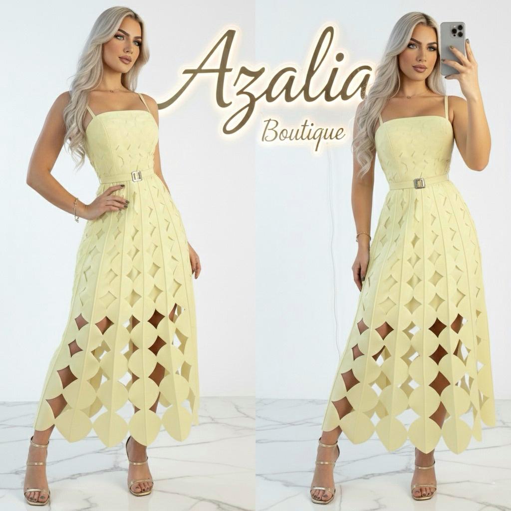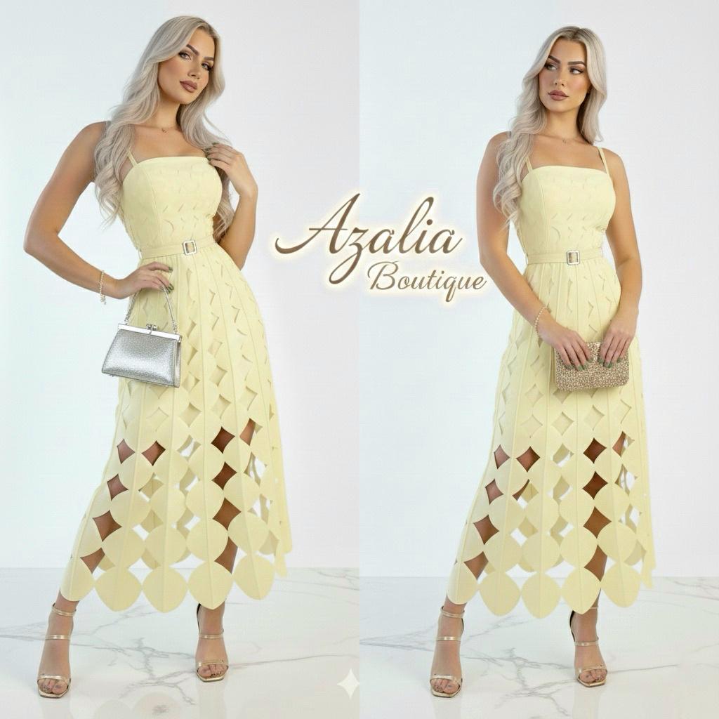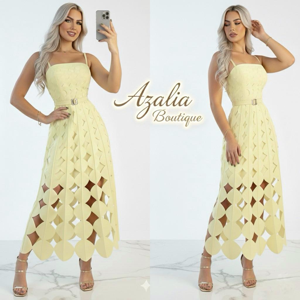 Luz, sofisticación y diseño en perfecta armonía. El vestido Geometría Amarilla destaca por su delicado tono amarillo mantequilla que ilumina la silueta con un aire fresco y femenino. Su diseño midi presenta un corte estructurado con tirantes finos y escote recto que realza elegantemente el torso.