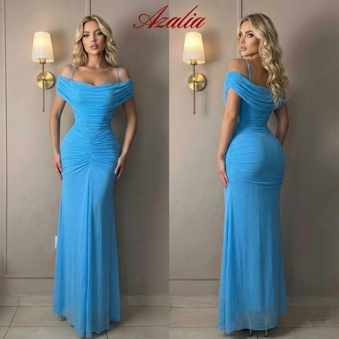 Confeccionado en tela suave y fluida, presenta un favorecedor drapeado que estiliza el cuerpo y un diseño off-shoulder con tirantes finos que aporta un toque sensual y refinado. Su corte largo y ajustado resalta las curvas de forma armoniosa, mientras que la caída ligera brinda movimiento y comodidad.