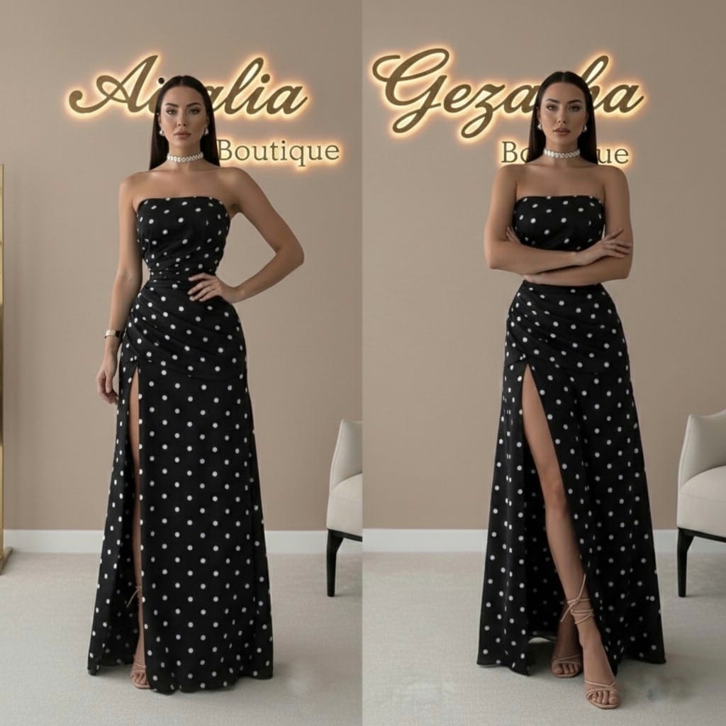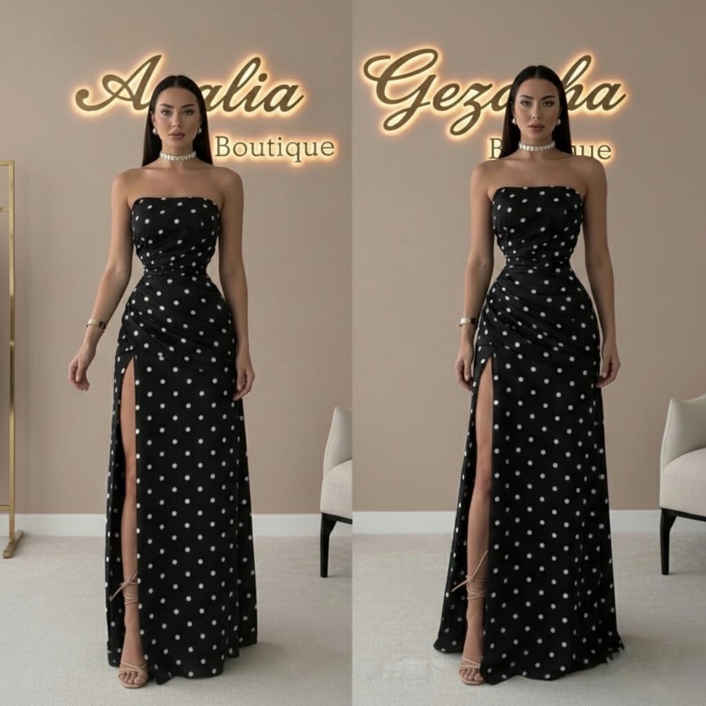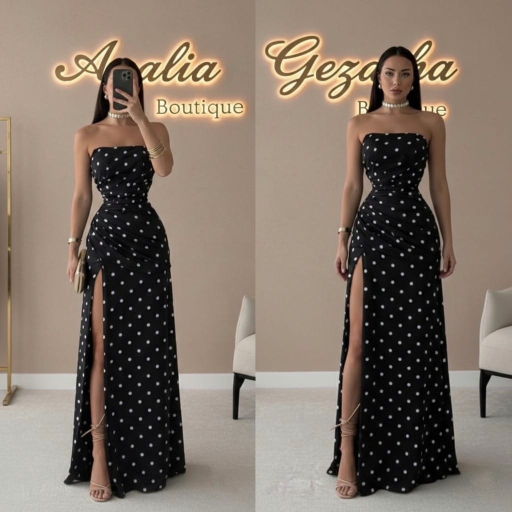 El Vestido Noche de Lunares es la definición perfecta de elegancia y sensualidad. Con su diseño strapless que realza el escote y su corte entallado que moldea la silueta, este vestido destaca por su estilo sofisticado y atemporal. Su estampado de lunares blancos sobre fondo negro aporta un toque clásico y chic, mientras que la abertura alta en la pierna le da un aire moderno y atrevido ideal para robar miradas.